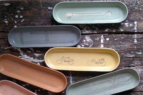 Das Geschirr von Sebastian Pertl (Deutschland) wirkt verspielt. Das liegt an den kecken Zeichnungen, die er darauf anbringt. Teller in Pastelltönen mit einem Fahrrad oder einer Kneifzange darauf bieten ein fröhliches Spektakel. Eine seiner Inspirationsquellen ist die Volkskunst von Bauern und Handwerkern aus der Region Landshut in Deutschland.